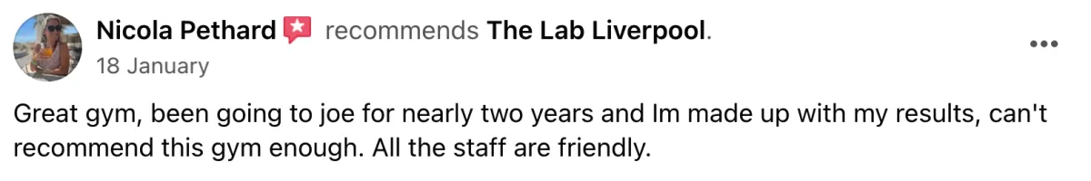 "The Lab is definitely a hidden gem of Liverpool, a great place to train with helpful and welcoming trainers! I spent 4 months doing the group PT and it was lovely, effective workouts and more affordable than 1 on 1 training. 10/10 would recommend." - Nicole